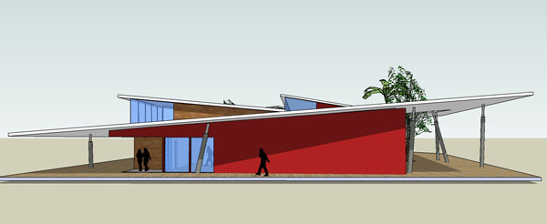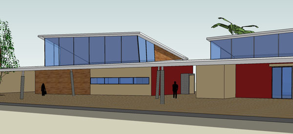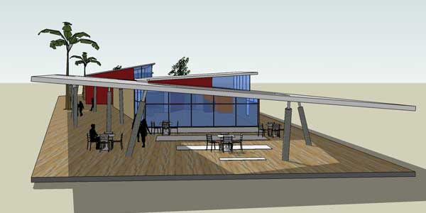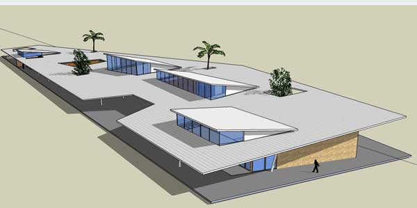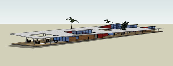 The proposal includes a modern looking centre using natural materials to integrate in the environment and minimise the visual impact in the landscape. All the venues are independent buildings grouped under one large roof to attenuate the hot climat. The chalets are spread further to keep the privacy.