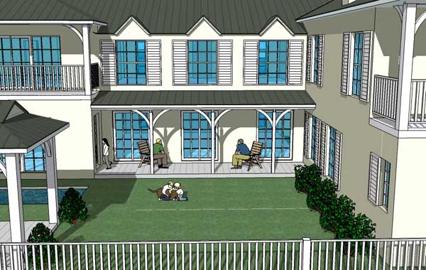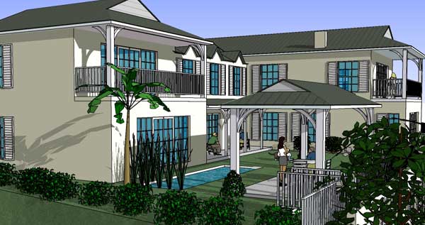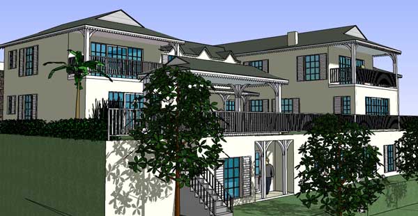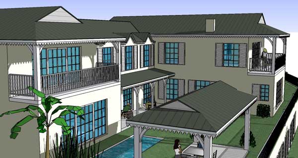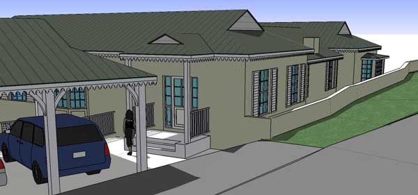 Keep the existing trees and shrubs to grow a mature English garden. A double-volume living space with exposed trusses provides a sense of light and space.