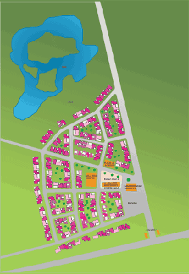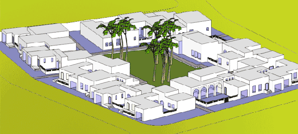 We grouped the residences around a group of amenities (gym, place of worship, street café, shops) that create a common destination. Each block of houses looks onto a green square with benches and kiosks.
