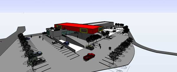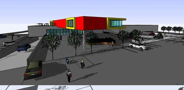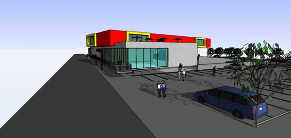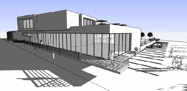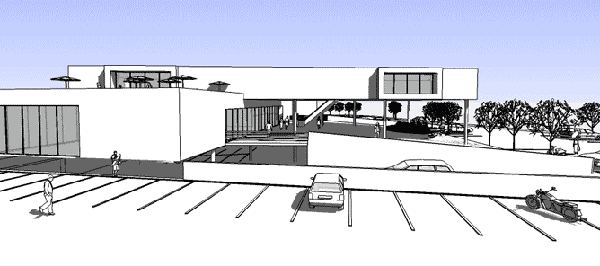 The building is a modern composition of simple volumes of different colours. The vehicle access is from the back, the all site slops to provide some extra parking underneath the main building. The covered piazza creates a sense of entrance. Restaurants are based on the first floor, using the roof as terraces to enjoy the view.